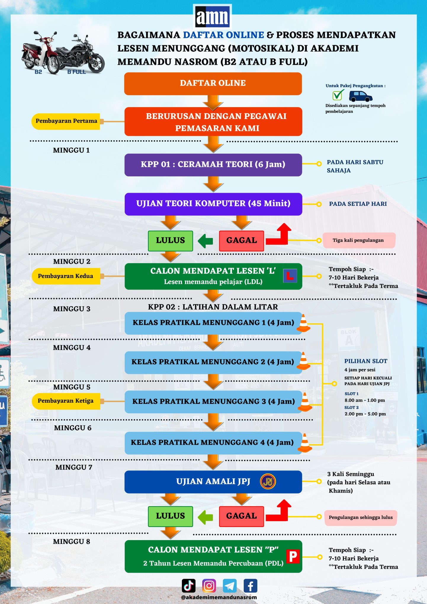 Sekiranya anda berumur sekurang-kurangnya 16 tahun, anda boleh memohon lesen motosikal di Akademi Memandu Metro. Jika anda penunggang baharu, anda perlu berlatih menunggang dan menimba pengalaman dari semasa ke semasa. Pengajar kami akan membimbing anda melalui kemahiran asas menunggang garisan lurus, berhenti, beralih dan membelok secara beransur-ansur menuju ke lencongan dan brek kecemasan.